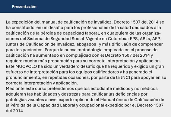 Curso de experto en calificación de la PCLO de las patologías visuales. Decreto 1507 del 2014