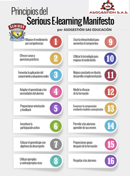 Con el objetivo de combatir esta tendencia nace el Serious E-learning Manifesto, un conjunto de normas que garantizan la excelencia de la formación en línea. En ASOGESTIÒN SAS EDUCACIÒN nos alegra inmensamente participar en el nacimiento de esta iniciativa que vela por la calidad de las experiencias de e-learning. En el gráfico que os dejamos a continuación puedes ver los 16 principios que este manifiesto comparte con la metodología de ASOGESTIÒN SAS EDUCACIÒN :